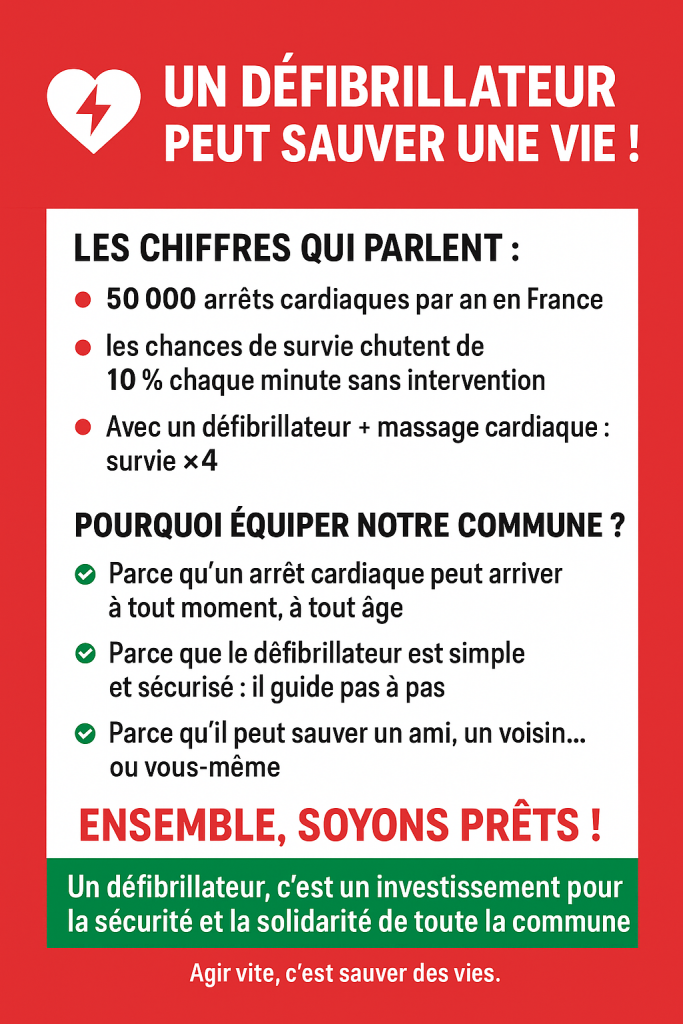 A Drocourt le défibrillateur est situé dans les locaux de la mairie au 1 rue du gué et indiqué par cette signalétique